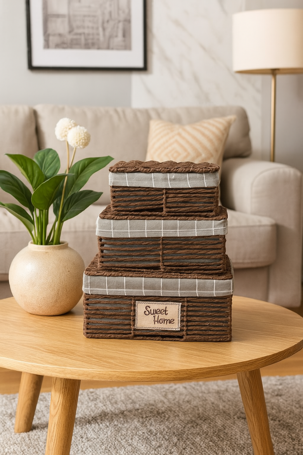 منسوجة يدويًا لإطلالة ريفية وعصرية، تتميز هذه السلة ببطانة قماشية ناعمة بنمط شبكي كلاسيكي، وملصق “منزل جميل” مطرز لإضفاء لمسة دافئة.