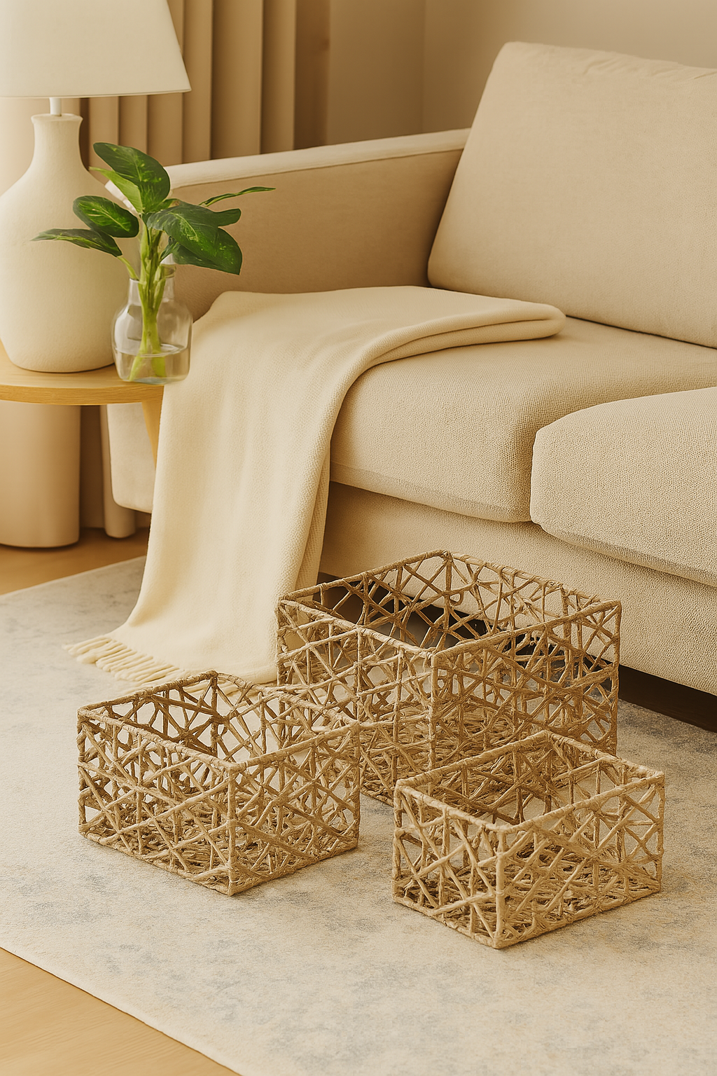 handmade Woven Round rectangular Paper String basket with steel frameSet includes sizes